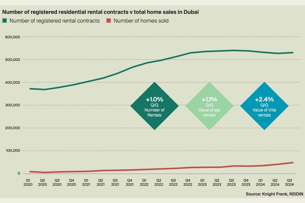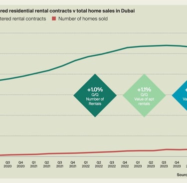 Dubai is a city of tenants, this chart goes beyond mere data; it encapsulates the very essence of modern Dubai. It unveils a profound truth: the emirate is not a city of homeowners, but a global powerhouse built on a foundation of tenants. In 2024, over half a million individuals signed rental contracts as compared to fraction of home sales. While Dubai shines as a magnet for international investment, a generation of young engineers, entrepreneurs, and professionals find themselves on the sidelines of the prosperity they are building. They are financially marginalized, their high rental payments funneled into an investor's yield instead of building their own equity, trapping them in a cycle that prevents them from ever saving enough to escape it.
